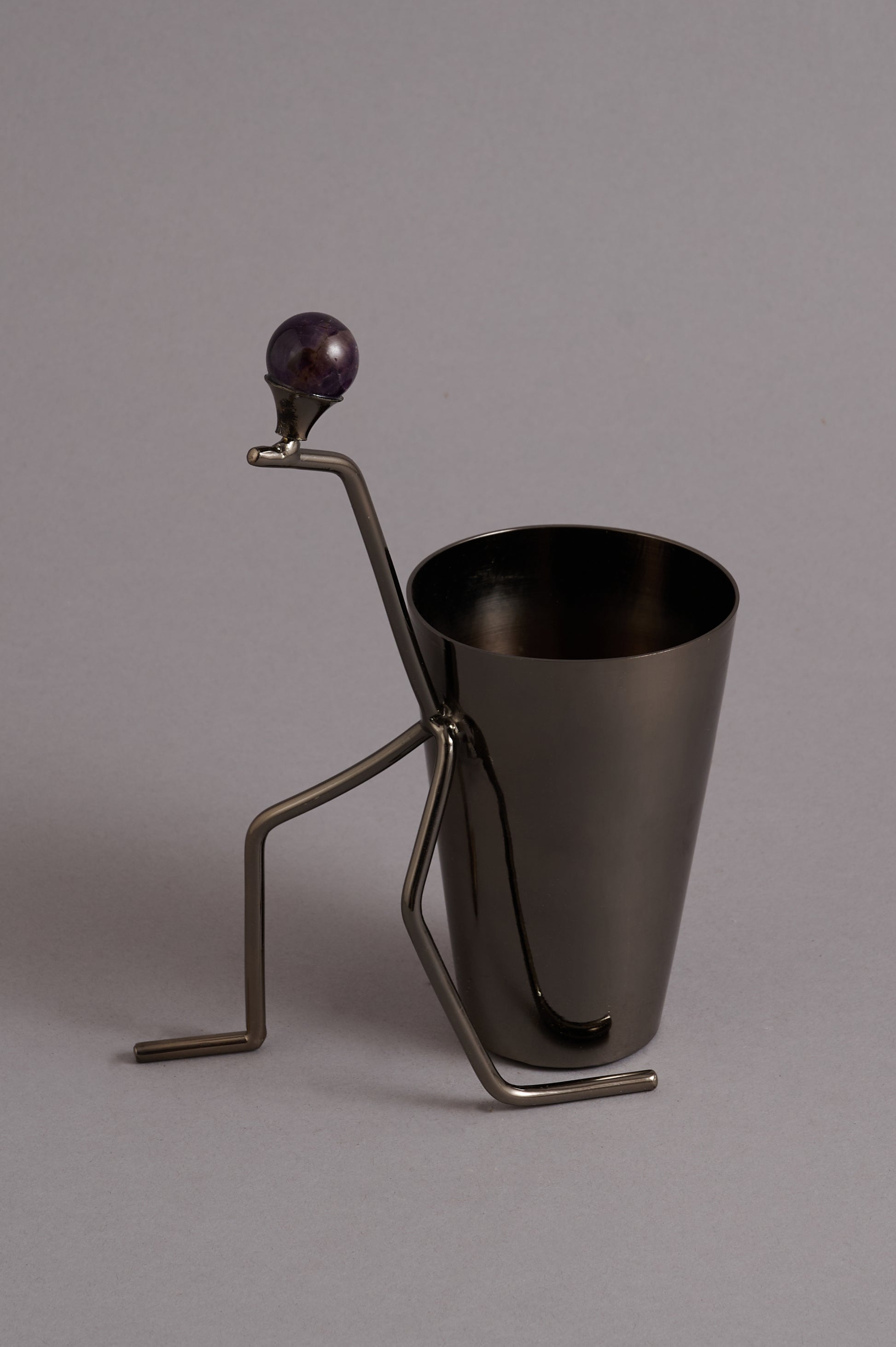 A statement tabletop accessory that merges art and function. Crafted in gunmetal-plated brass with a food-safe PVD stainless steel cutlery set, this holder features a sculptural figure detail with an amethyst gemstone accent — perfect for modern dining settings.