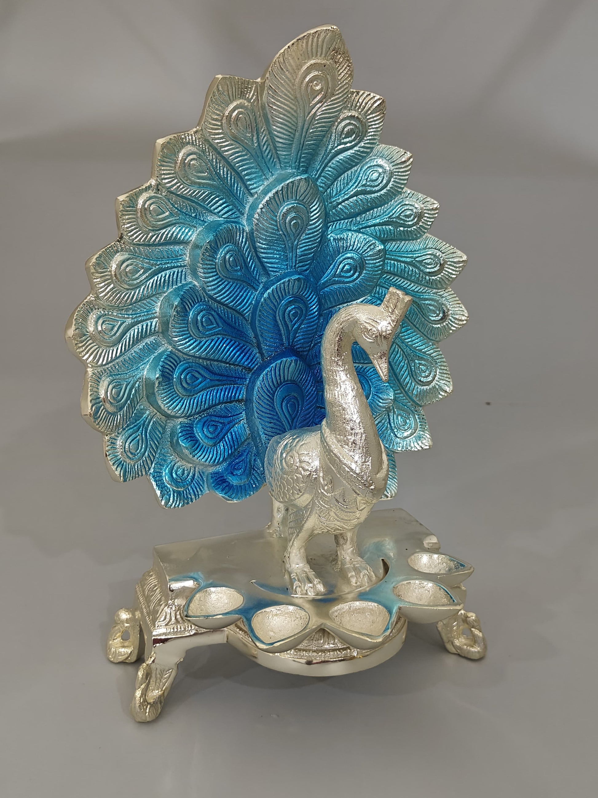 A stunning decorative figurine of a peacock with hand-painted blue feather detailing. Made from silver-plated aluminium, this piece captures the grace and charm of traditional Indian art — ideal for gifting or home décor.