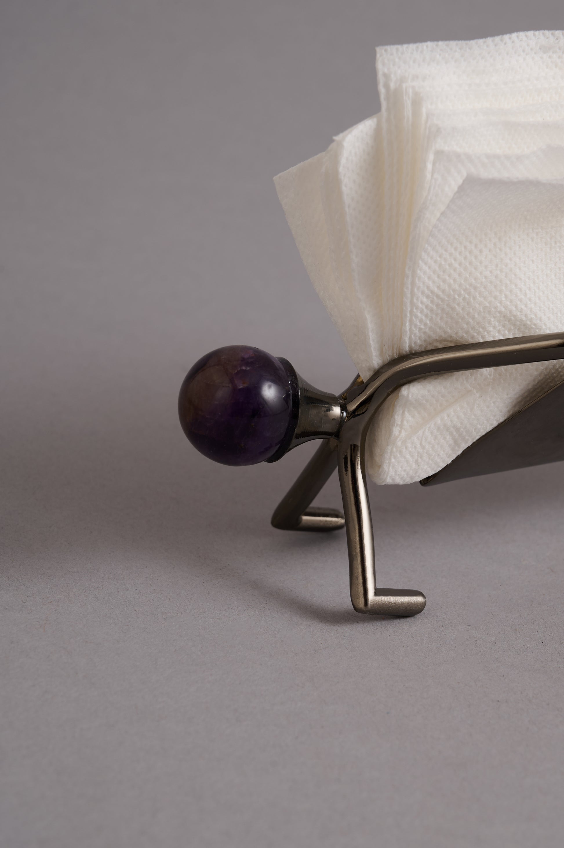 Functional meets artistic in this minimal napkin holder, made from gunmetal-plated brass with an amethyst gemstone accent. Its clean, balanced design complements any modern dining setup.
