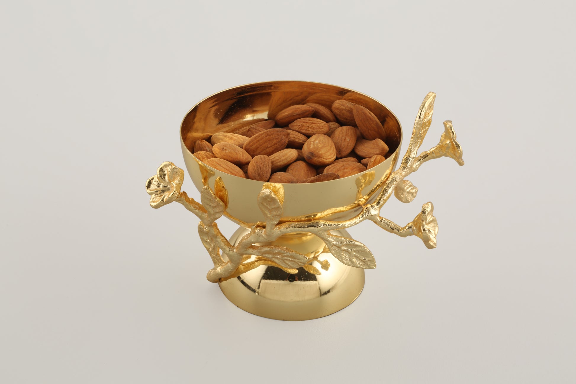 A sleek stainless-steel bowl resting on a handcrafted brass base with delicate branch detailing. Finished in silver plating, this elegant piece is perfect for serving dry fruits, nuts, or as a decorative accent for your coffee table.